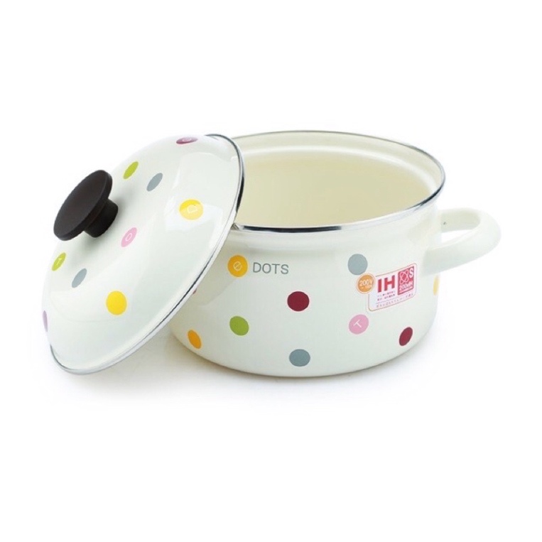 Nồi quánh thép tráng men chống dính Nhật cao cấp Fujihoro ( hoa văn chấm bi ) , sử dụng đc mọi bếp 16cm / 18cm / 20cm