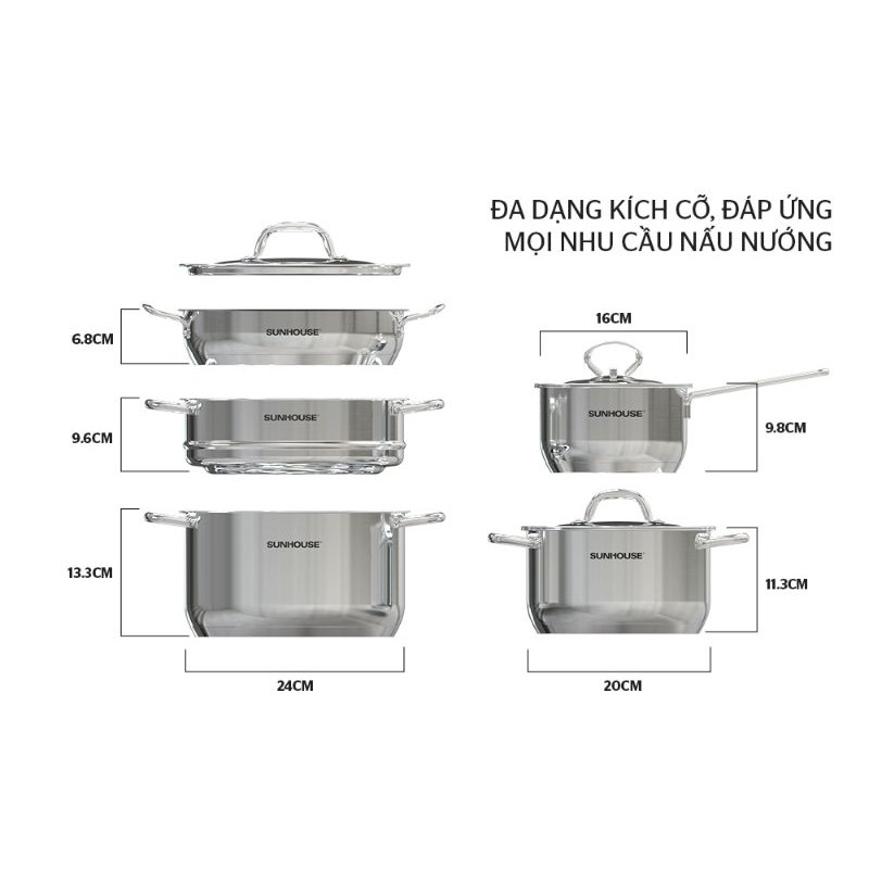 Bộ nồi chảo inox 5 đáy SUNHOUSE SHG995 sử dụng được với mọi loại bếp, kể cả bếp từ. Bộ sản phẩm gồm 01 quánh 16 cm, 02 nồi với đường kính 20 – 24 cm, 01 chảo 24 cm và 01 xửng hấp 24 cm phù hợp với nhu cầu nấu nướng của mọi gia đình. Quánh nhỏ 16cm thích hợp để luộc trứng, nấu mì, nấu cháo, nồi cỡ trung 20 – 24 cm để nấu canh, nấu lẩu cho 2 – 4 người và chảo 24 cm có chiên xào lượng thực phẩm lớn cho 3 – 5 người ăn. Ngoài ra, với xửng hấp 24 cm đi kèm, bạn sẽ dễ dàng hấp xôi, bánh bao, hâm nóng thức ăn và chế biến nhiều món ăn khác cho gia đình.