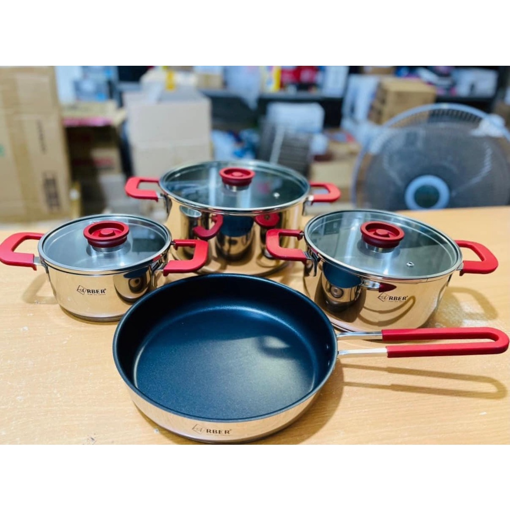 Bộ nồi từ chảo 4 chiếc cao cấp ARBER làm bằng chất liệu thép không gỉ, đáy bộ nồi 3 đáy siêu bền khi sử dụng, bộ nồi tiếp xúc nhiệt nhanh, êm, tản nhiệt đều khi nấu.