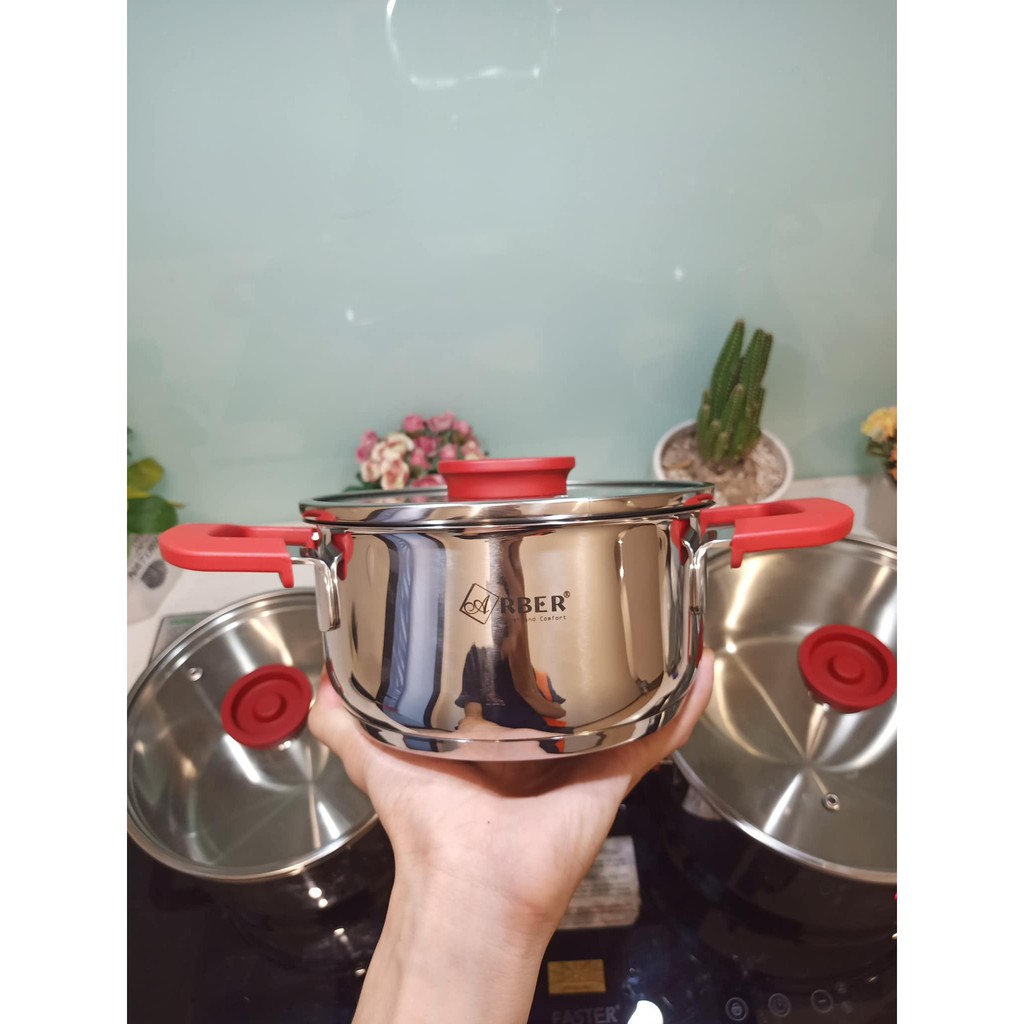 Kiểu dáng sang trọng xếp được vào với nhau, gọn gàn ARBER làm bằng chất liệu thép không gỉ, đáy bộ nồi 3 đáy siêu bền khi sử dụng, bộ nồi tiếp xúc nhiệt nhanh, êm, tản nhiệt đều khi nấu.