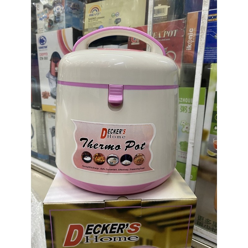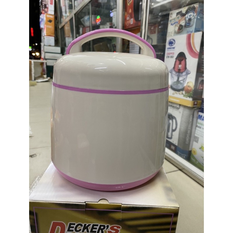 Nồi ủ Themos hay còn gọi là nồi ủ Decker Home 2,5 lít, sản phẩm tiện lợi và an toàn cho sức khỏe người dùng. Với nồi ủ này bạn có thể dùng mang cơm theo ăn mà thức ăn vẫn còn nóng khi bạn dùng, không cần phải hâm lại, không phải còn cảnh ra ngoài ăn cơm tiệm, một mặt tồn tiền và lại không an toàn thực phẩm nữa.Cấu tạo và tổng quan về sản phẩm: Nồi gồm có 1 lòng nồi bằng inox dầy giúp cho việc giữ nhiệt lâu hơn và bền hơn theo thời gian, 1 khay đựng thức ăn bằng nhựa có 3 ngăn, 1 nồi bên ngoài làm nhựa có đính kèm hoa văn sang trọng và phong cách. Nấp đậy thiết kế mới với hệ thống nắp kép giữ nhiệt kín không cho nhiệt ra ngoài. Cho thức ăn của bạn luôn được giữ nóng.