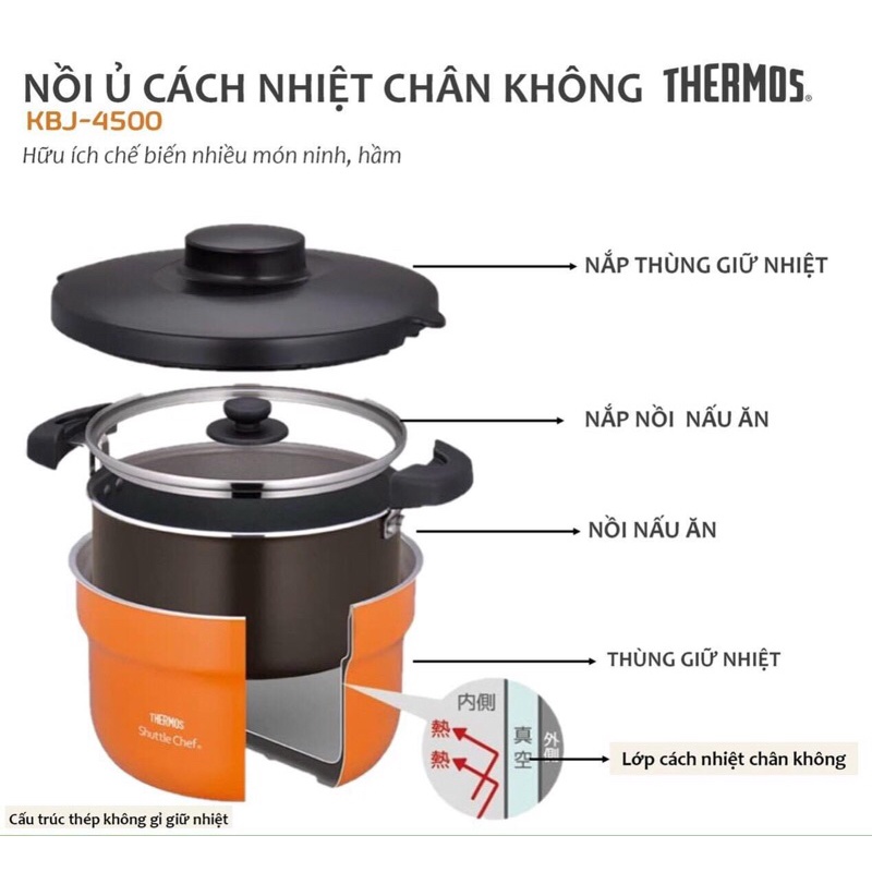 Nồi ủ Thermos có tác dụng làm nhừ thức ăn trong nồi mà không tốn năng lượng, tiết kiệm thời gian nấu nướng. Do giữ nhiệt bằng chân không và nhiệt độ cao nhất khoảng 100độ nên đồ ăn trong nồi không có mùi hầm và không bị mất các chất vitamin.