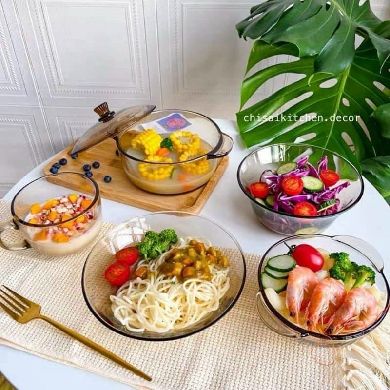 Bộ nồi và chén bát thuỷ tinh trong suốt 5 món cao cấp phong cách Hàn Quốc cực sang - Bộ tô chén thuỷ tinh decor bàn ăn