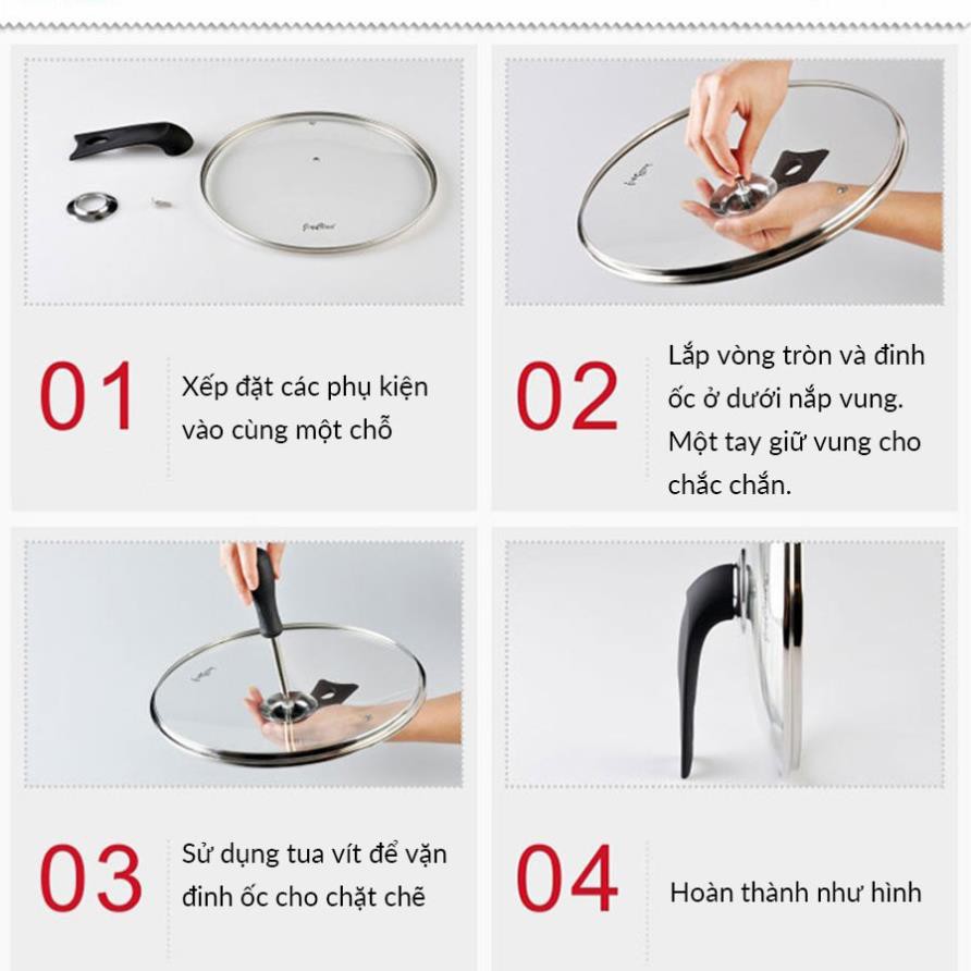 Vung kính viền inox: Vung nồi bằng kính cường lực trong suốt dày dặn, chịu nhiệt tốt với phần núm bằng nhựa bakelit bọc silicon cách nhiệt. Viền inox chắc chắn giúp hạn chế nguy cơ nứt vỡ nếu chẳng may bị rơi.