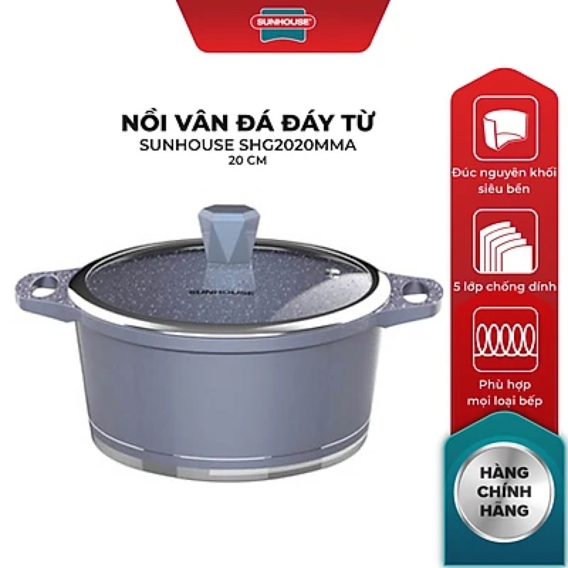 Nồi Vân Đá Đáy Từ Sunhouse SHG2020MMA - Xanh là sản phẩm quen thuộc nhưng lại rất nổi bật bởi thiết kế hiện đại và khả năng chống dính siêu bền, dẫn nhiệt tốt, an toàn tuyệt đối cho sức khỏe và dùng được cho mọi loại bếp.Nồi được làm từ nhôm đúc nguyên khối siêu bền, có khả năng chống va đập cực tốt. Chất liệu nhôm còn có khả năng dẫn nhiệt tốt, tỏa nhiệt đều giúp món chiên xào được ngon hơn.