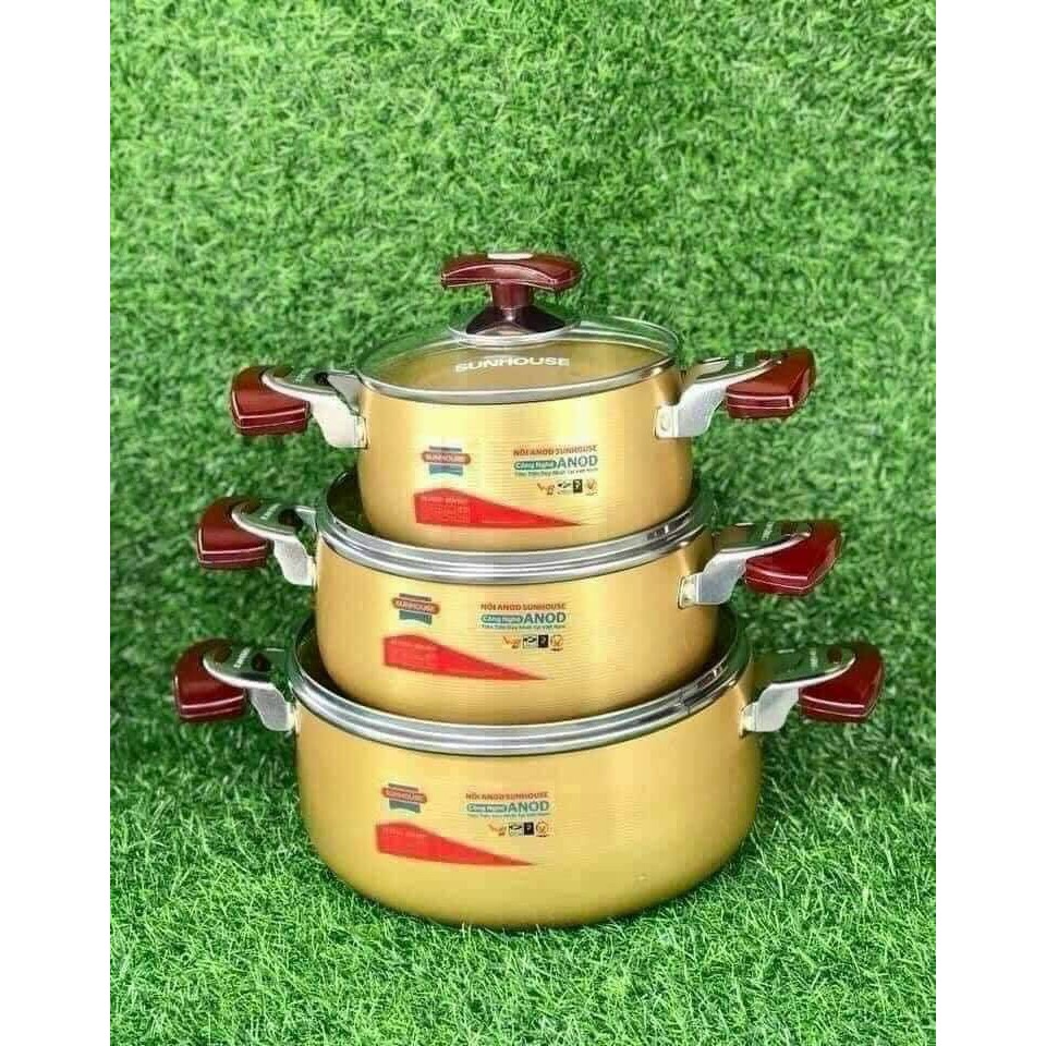 BỘ NỒI VÀNG SUNHOUSE 6634 ĐẸP LONG LANH. Bộ nồi 6634 ĐANG hót nhất năm nay đây ạ.✔️Nồi bằng hợp kim nhôm, đã trải qua quá trình xử lý Anodizing bền cứng.