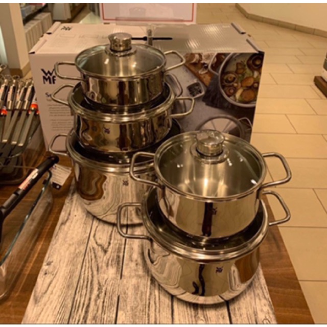 - Bộ nồi cao cấp WMF 5 món hiện đại, tinh tế, sang trọng với chất liệu Cromargan và thép không ghỉ 18/10 sáng bóng