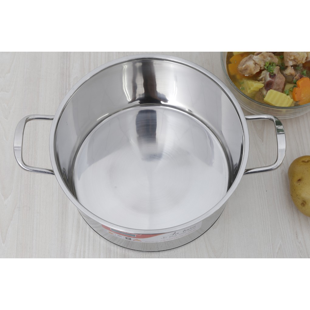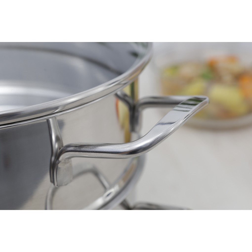 Bộ sản phẩm gồm một nồi và một xửng có đường kính 24cm, thiết kế “2 trong 1”, có thể sử dụng độc lập nồi hoặc kết hợp nồi và xửng cho nhiều mục đích nấu nướng tại gia đình. Nồi có chiều cao khoảng 20m, dùng để luộc gà, nấu canh, nấu phở hoặc nấu lẩu cho nhiều người. Khi kết hợp với xửng hấp, bạn có thể hấp xôi, bánh bao hoặc các loại thực phẩm như thịt cá, rau củ rất tiện lợi.