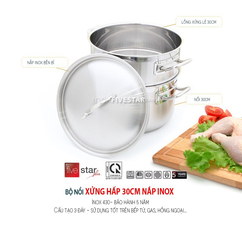 Bộ nồi xửng hấp Fivestar 3 đáy inox 430 nắp inox ( 30cm ) , dùng được bếp từ , hồng ngoại , gas