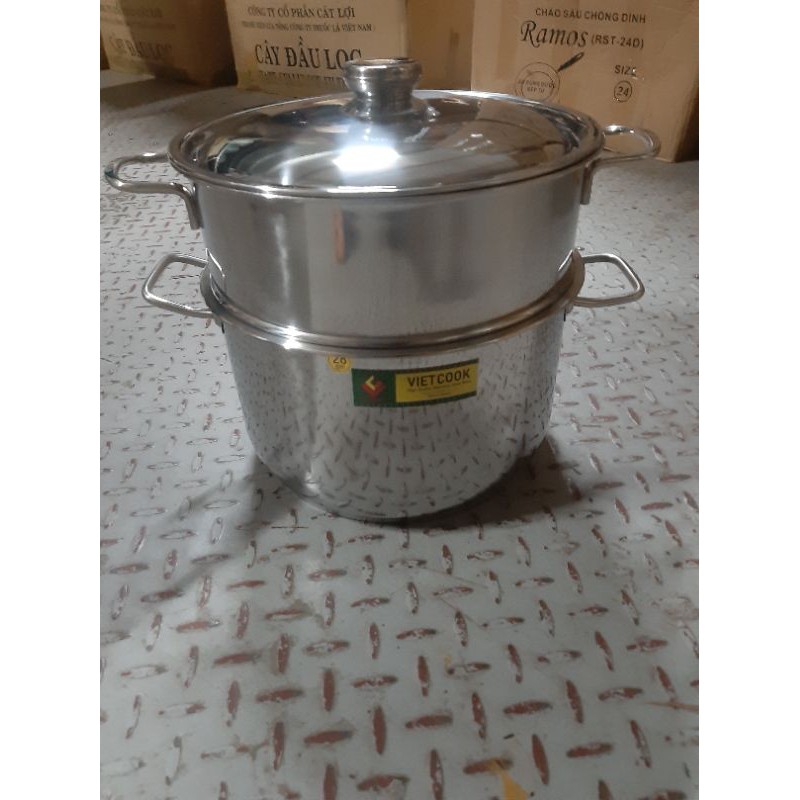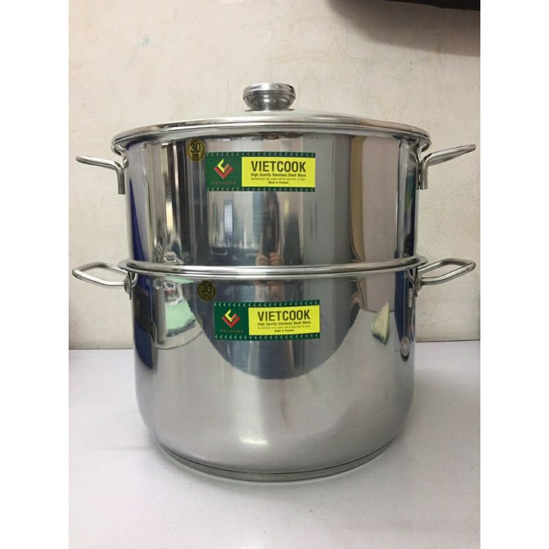 Nhà cửa & Đời sống > Dụng cụ nhà bếp > Nồi || Bộ nồi xửng hấp inox ,xửng hấp inox 2 tầng 3 đáy nắp kính,nắp inox VietCook đun bếp từ size 32/chõ hấp đồ xôiCòn hàng