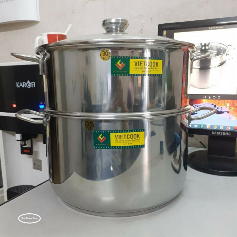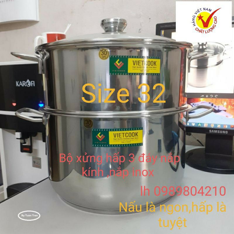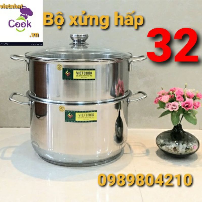 Bộ nồi xửng hấp inox ,xửng hấp inox 2 tầng 3 đáy nắp kính,nắp inox VietCook đun bếp từ size 32/chõ hấp đồ xôi