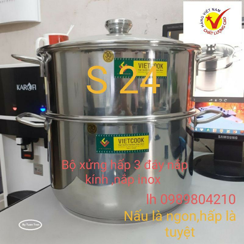 Giới thiệu Bộ nồi xửng hấp inox ,xửng hấp inox 2 tầng 3 đáy nắp kính,nắp inox VietCook đun bếp từ size 24 chõ hấp xôi