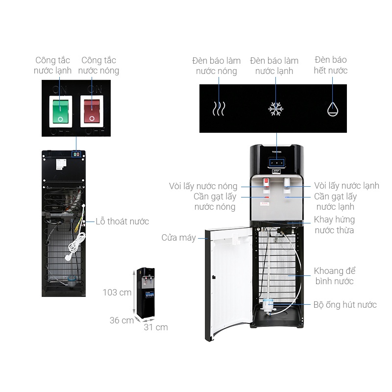 💛 Đèn báo nóng lạnh và đèn báo hết nước giúp người dùng dễ theo dõi tình trạng nước trong bình chứa khi sử dụng