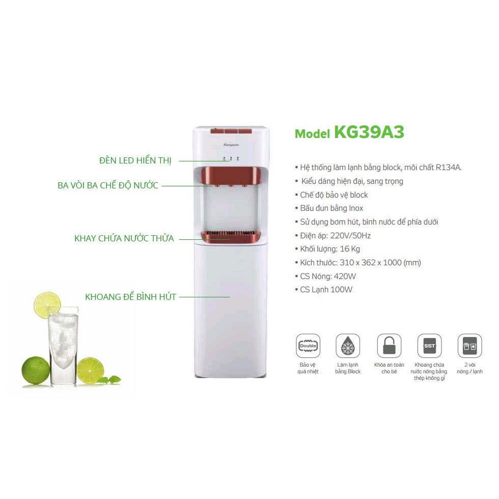 Nguồn nước từ máy làm nóng lạnh nước uống KG39A3 cho ra 03 vòi nóng lạnh, máy dễ lắp đặt ít hao tốn điện năng, hoạt động trong trạng thái Auto tự đóng ngắt điện, nước khi không sử dụng. Khi công việc ngày càng bận rộn, người dùng cần một thiết bị thật là tiện nghi, tiện dụng với máy lọc nước uống trực tiếp 2 vòi nóng lạnh, vòi là nước nóng đáp ứng nhu cầu sử dụng cho việc pha trà, pha cà phê, vòi lạnh làm lạnh nước uống cho mùa hè giảm bớt cái nắng nóng.