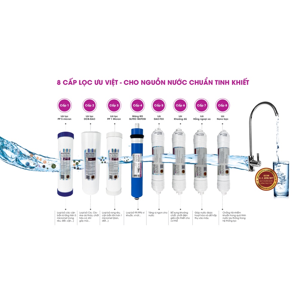 + Sử dụng màng RO Mutosi - Công nghệ Slitec tiên tiến, đạt tiêu chuẩn NFS/ANSI 58 – Tiêu chuẩn toàn cầu cho màng lọc RO.