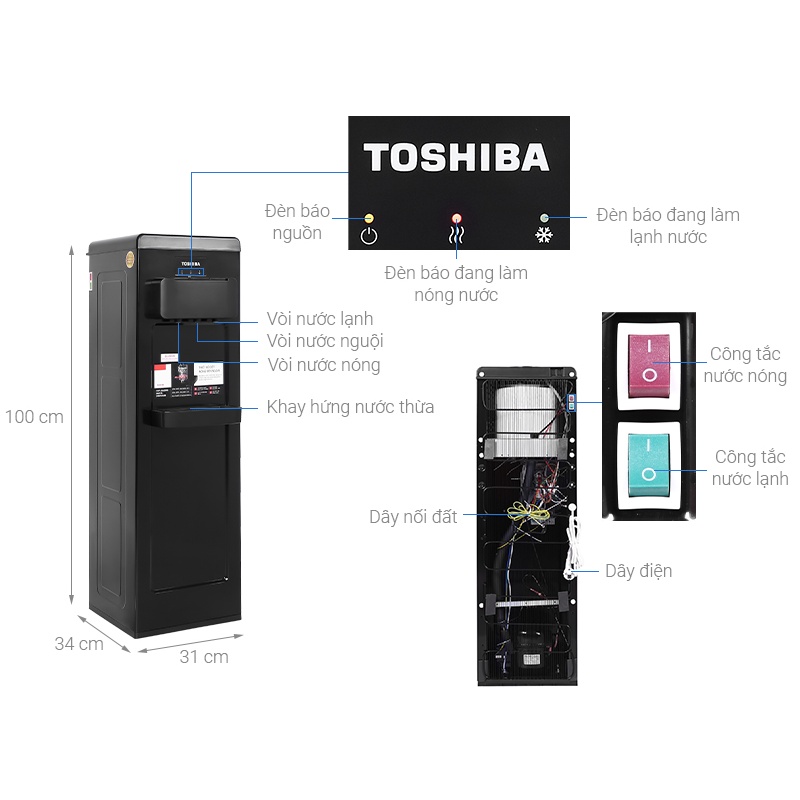 - Tiện ích: Khóa vòi nước nóng, Có khoang chứa đựng ly tách, Khay hứng nước, Có đèn báo nóng lạnh