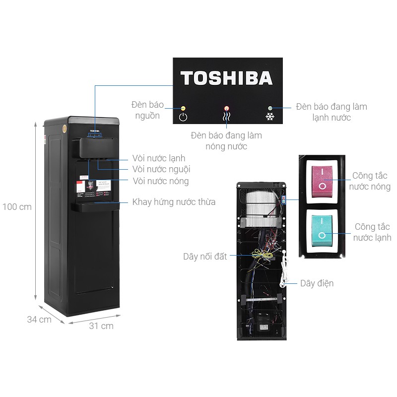 - Tiện ích: Khóa vòi nước nóng; Có khoang chứa đựng ly tách; Khay hứng nước; Có đèn báo nóng lạnh;