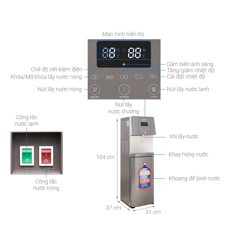 ✅ Thiết lập 3 chế độ nước nóng, nước thường và lạnh, với nhiệt độ làm nóng đạt 85 - 95 độ C, nhiệt độ làm lạnh từ 5 - 9 độ C