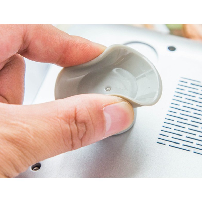 * Hướng dẫn sử dụng: ấn nút chêm lên bề mặt đáy laptop và đè mạnh để nút hít chặt, có thể dùng keo hai mặt dán kèm nếu không dính chắc. Khi tháo ra gỡ nút nhỏ dưới chân đế để không khí thoát ra ngoài, đồng thời gỡ bỏ nút chêm.