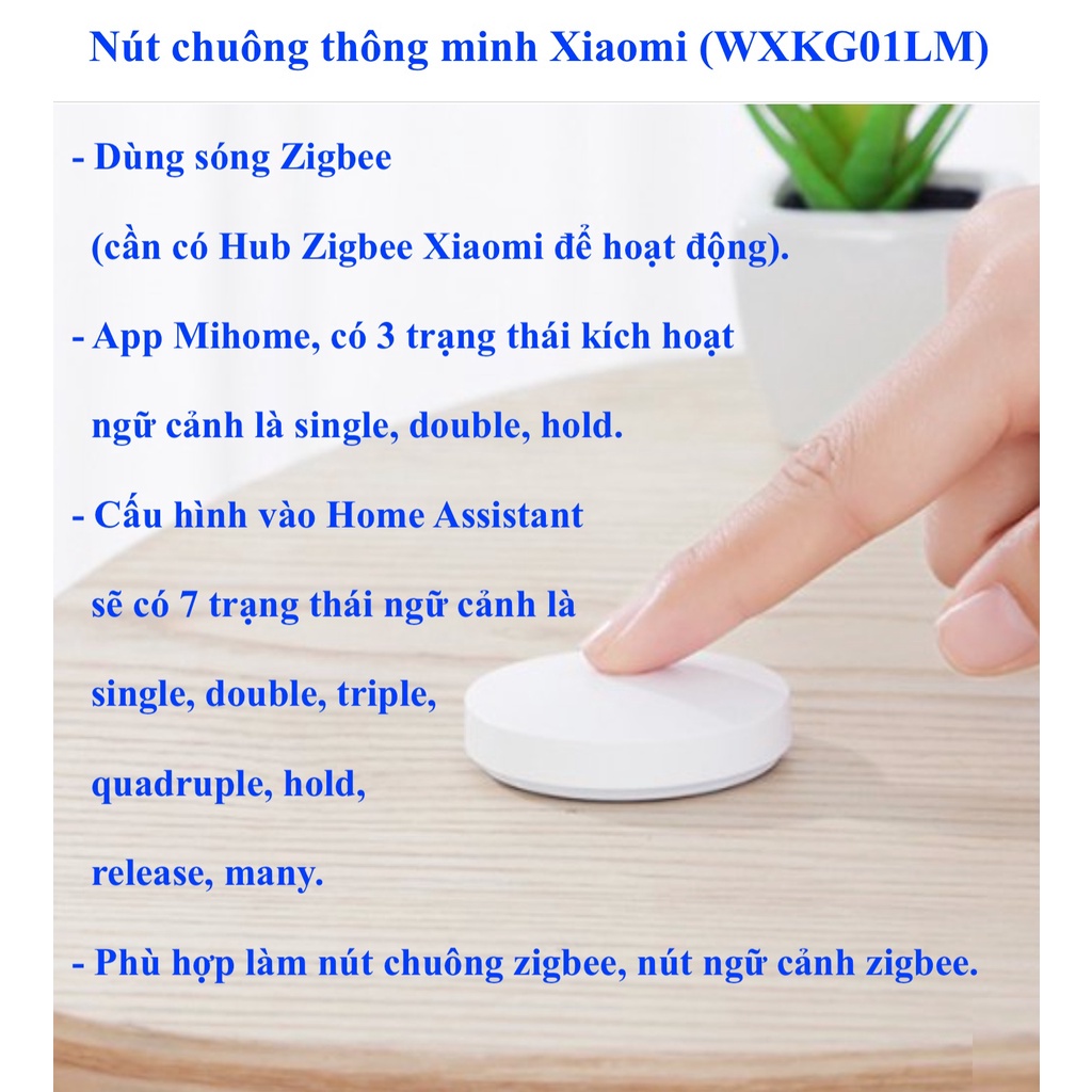 - Có thể cấu hình vào Home Assistant qua Zigbee2mqtt hoặc ZHA, 7 trạng thái kích hoạt ngữ cảnh: single/ double/ triple/ quadruple/ hold /release/ many.
