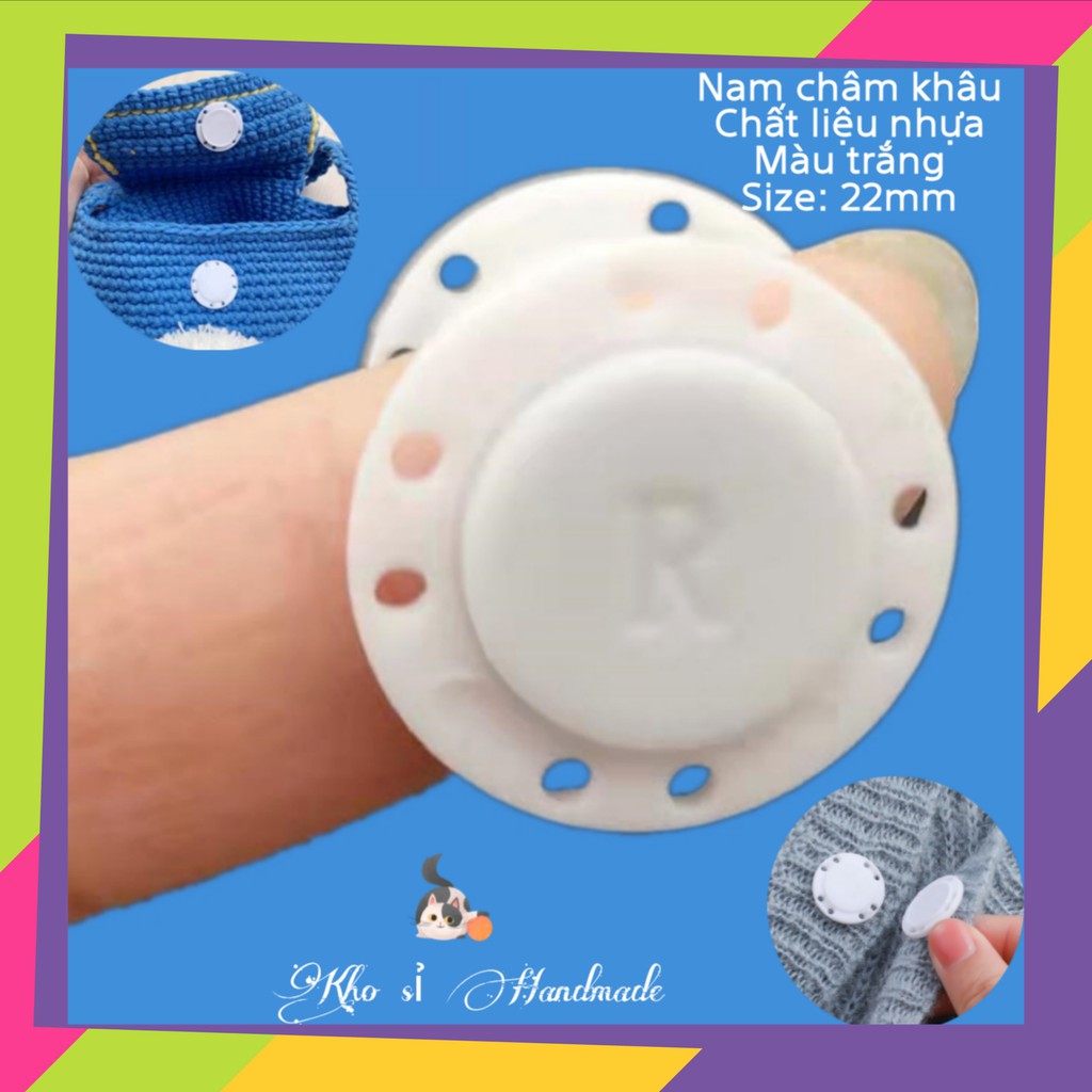 Nút hít khâu bằng nhựa màu trắng còn gọi nút hít dùng làm nút nam châm hít cho túi handmade bằng da, vải, len sợi...Thay vì dùng móc khóa, cài dây, nhà sản xuất ứng dụng nam châm nút hít làm cho việc đóng chặt và mở dễ dàng hơn.