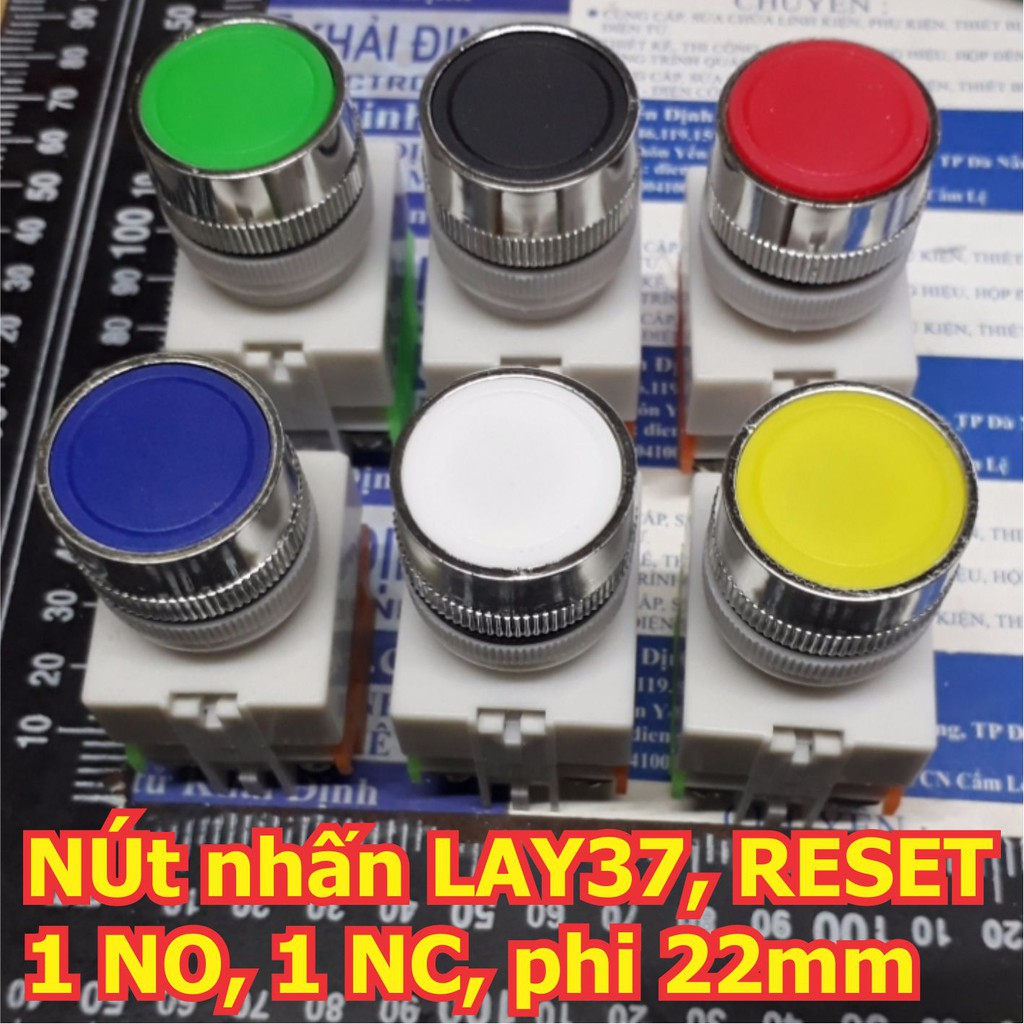 Nút nhấn công nghiệp RESET, ấn nhả LAY37 (PCBY090), 1 thường đóng, 1 thường mở, phi 22mm, có 6 màu kde5581giá cho 2 cái cùng màu.