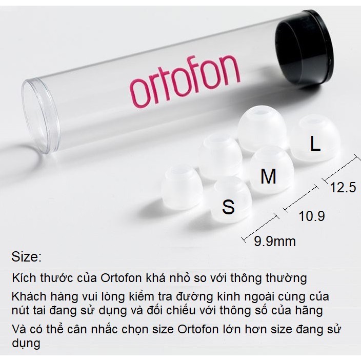 Kích thước của nút tai Ortofon nhỏ hơn so với thông thường, vì vậy khách hàng có thể cân nhắc size Ortofon lớn hơn size nút tai đang sử dụng (chỉ mang tính tham khảo, vì size các hãng sẽ có kích thước khác nhau).