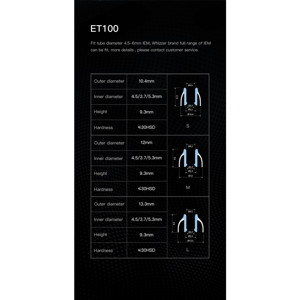 Tip Whizzer ET100 được cấu thành từ 2 lớp silicon có độ tinh khiết cao, mang lại độ mềm cứng thấp hơn 30 HSD khi so sánh với những bộ tip thông thường có độ cứng từ 30-40 HSD. Lớp mũ tip silicon bên ngoài ET100 mỏng nhưng có được độ đàn hồi cao được thiết kế để cho lại cảm giác đeo thoải mái, mềm mại hơn bằng việc giảm áp lực bên trong tai người nghe.Phần thành tip bên trong được thẳng đứng làm cứng và dày dặn hơn, đảm bảo tips sẽ không bị biến dạng sau thời gian dài sử dụng, cũng như làm tăng tuổi thọ của tip.