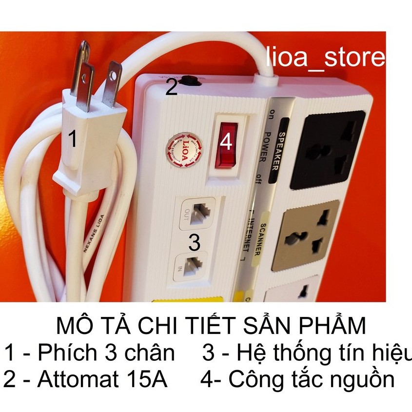 -Thân ổ cắm màu trắng/ đen có gắn thương hiệu LiOA . Mỗi ổ cắm mang 1 màu sắc khác nhau giúp cho người SD phân biệt dc dễ ràng khi dùng nhiều thiết bị cùng 1 lúc. trên mỗi mặt nắp nhựa ổ cắm đều có chữ LiOA. ( để tránh hàng giả hàng nhái). các ổ cắm dều có nắp che AN TOÀN . ( tránh trường hợp nhà có trẻ con vô ý thò tay vào ổ cắm khi đang có điện . khoảng cách giữa các ổ là đảm bảo cắm dc các phích có bản to.