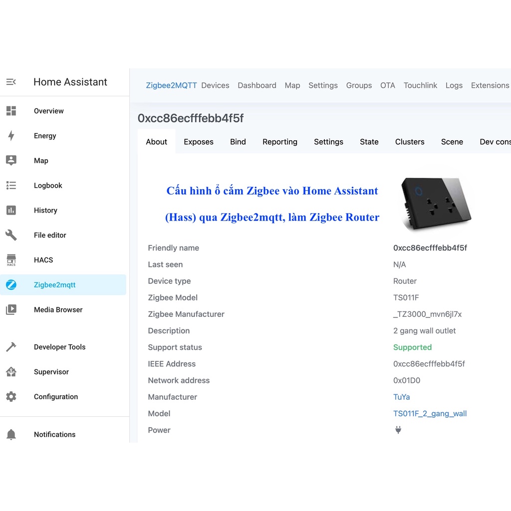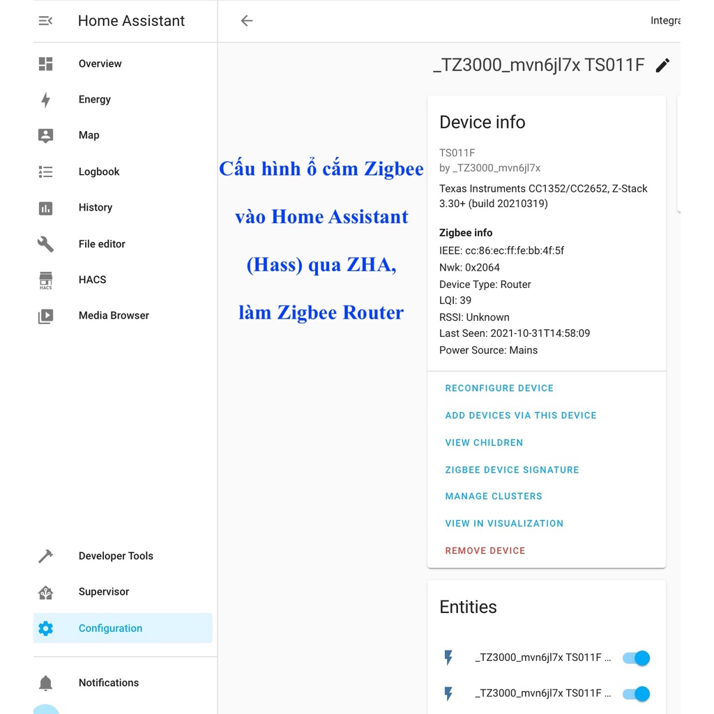 Có thể cấu hình vào Home Assistant thông qua Zigbee2mqtt / ZHA đối với loại Zigbee; Localtuya/ Integration Tuya đối với loại Wifi.