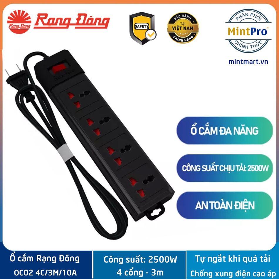 Ổ cắm đa năng 4 ổ cắm 3m OC02 4C/3M/10A chính hãng Rạng Đông, an toàn tự ngắt khi quá tải, nhựa ABS siêu bền chống cháy