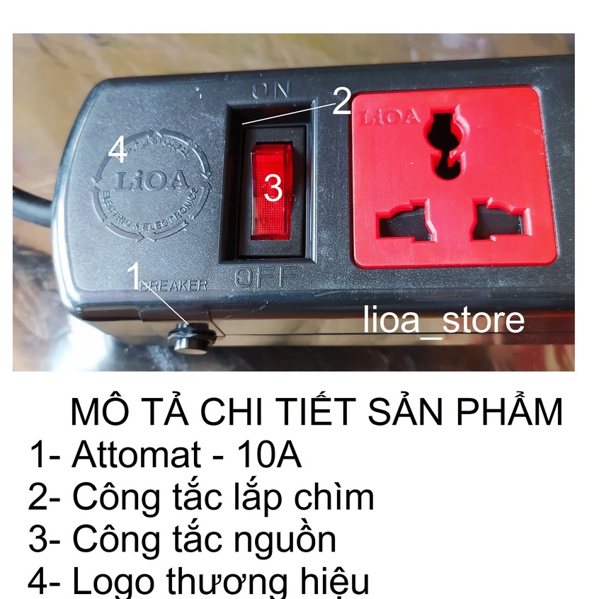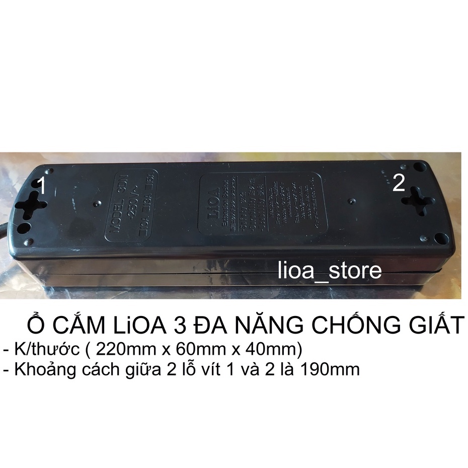 -Thân ổ cắm màu đen. có gắn thương hiệu LiOA . Mỗi ổ cắm mang 1 màu sắc khác nhau giúp cho người SD phân biệt dc dễ ràng khi dùng nhiều thiết bị cùng 1 lúc. trên mỗi mặt nắp nhựa ổ cắm đều có chữ LiOA. ( để tránh hàng giả hàng nhái).ĐẶC BIỆT là các ổ cắm dều có nắp che AN TOÀN . ( tránh trường hợp nhà có trẻ con vô ý thò tay vào ổ cắm khi đang có điện . khoảng cách giữa các ổ là đảm bảo cắm dc các phích có bản to.