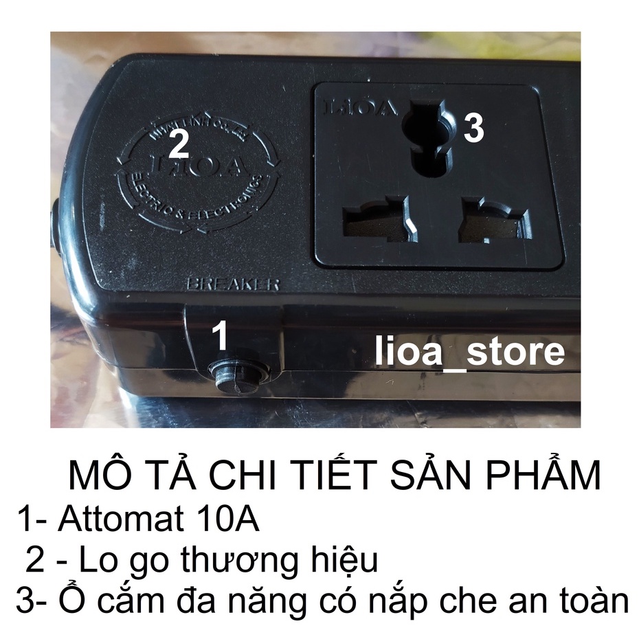 -Thân ổ cắm màu đen. có gắn thương hiệu LiOA . Mỗi ổ cắm mang 1 màu sắc khác nhau giúp cho người SD phân biệt dc dễ ràng khi dùng nhiều thiết bị cùng 1 lúc. trên mỗi mặt nắp nhựa ổ cắm đều có chữ LiOA. ( để tránh hàng giả hàng nhái).ĐẶC BIỆT là các ổ cắm dều có nắp che AN TOÀN . ( tránh trường hợp nhà có trẻ con vô ý thò tay vào ổ cắm khi đang có điện . khoảng cách giữa các ổ là đảm bảo cắm dc các phích có bản to.