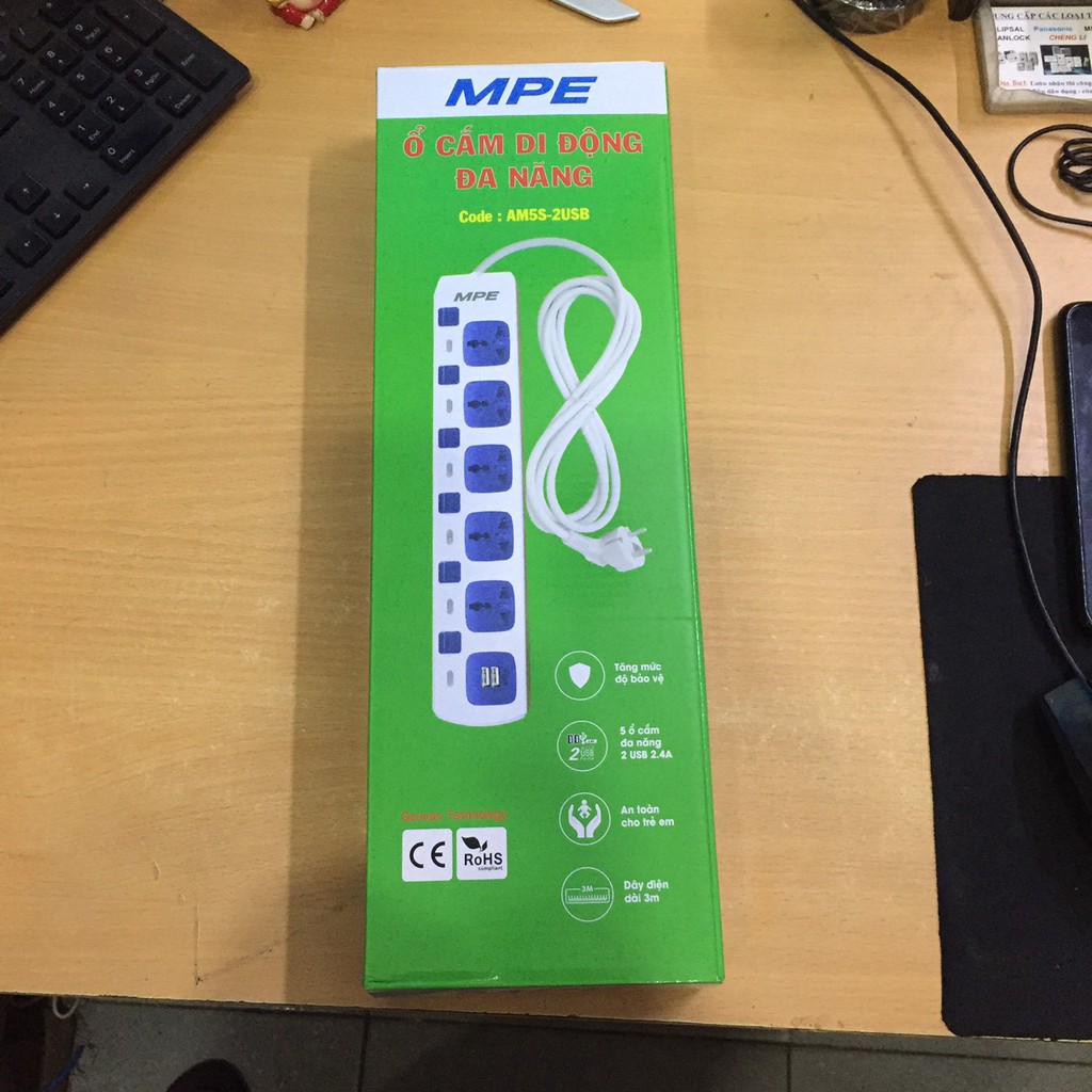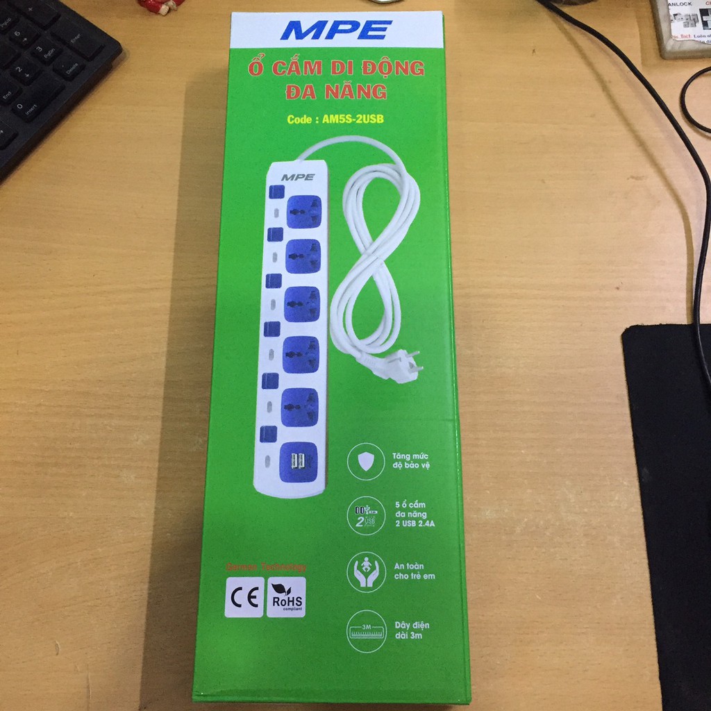 Ổ CẮM DÂY 5 Ổ 3 CHẤU ĐA NĂNG TÍCH HỢP 2 CỔNG USB MPE MODEL:AM5S-2USB