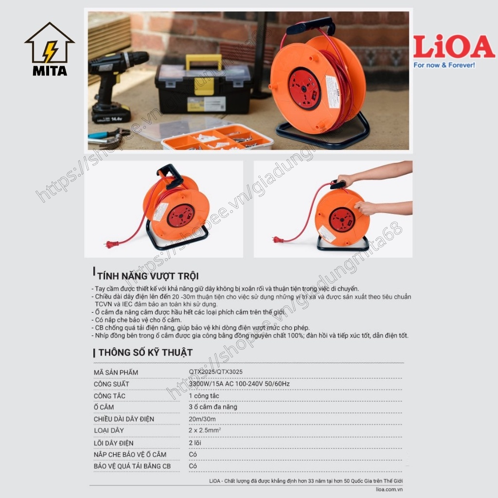 Giới thiệu Ổ cắm điện LiOA, ổ điện kéo dài quay tay dây dài 20m/30m kiểu RULO loại chống xoắn LiOA QTX2025 / QTX3025 - MITA