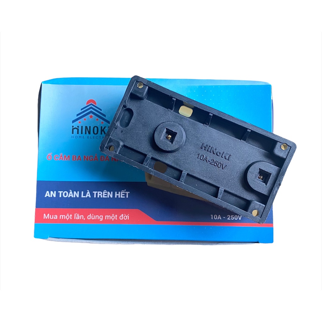 Ổ cắm điện 3 ngả, có lỗ cắm đa năng đế đen Hinoki 10A-250V, mặt ổ cắm chống cháy, chống va đạp