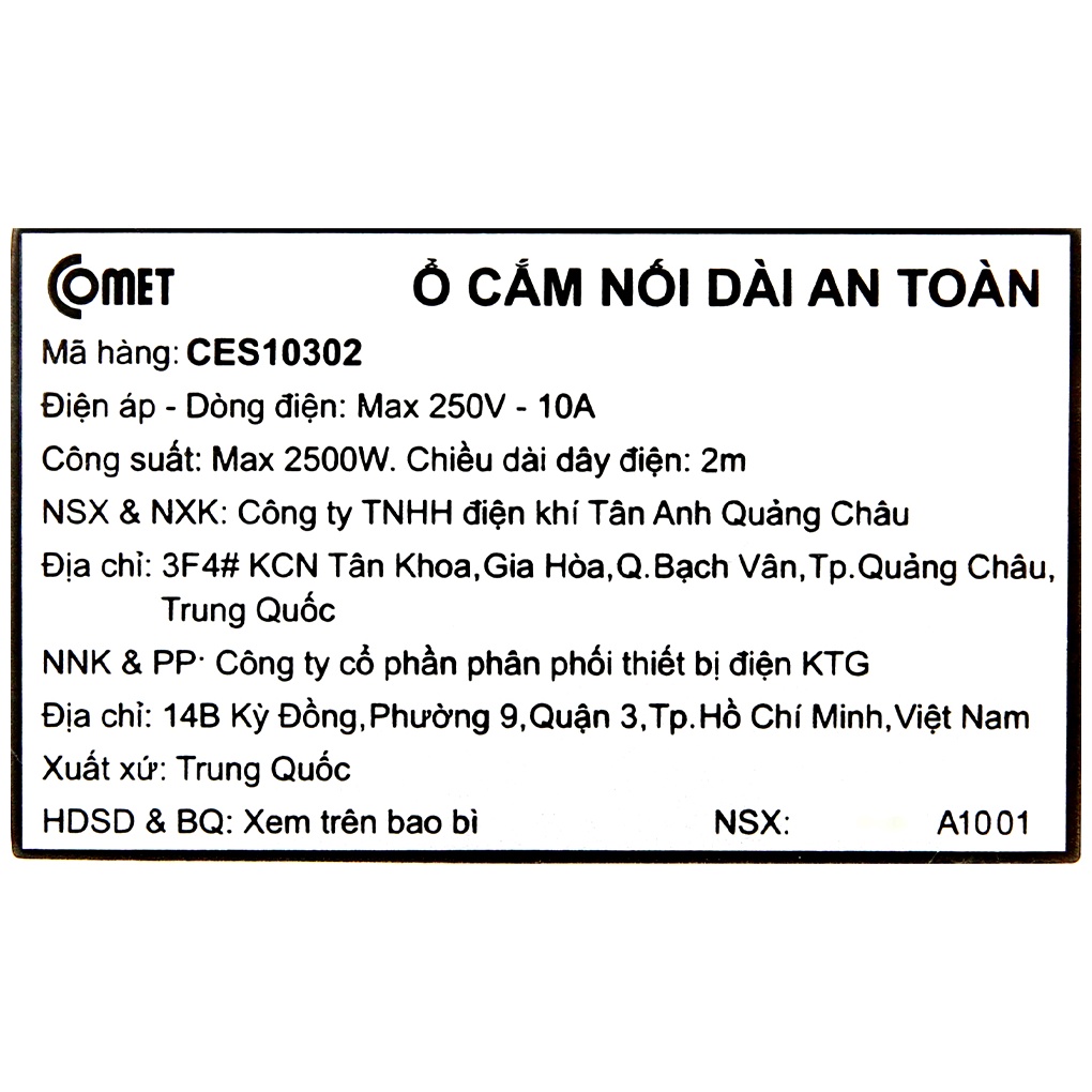 Giới thiệu Ổ cắm điện 3 ổ cắm 3 chấu 2m Comet CES10302