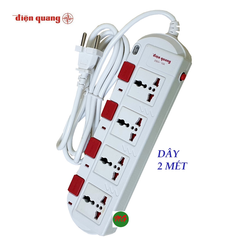 Ổ cắm điện 4 ổ cắm 4 công tắc dây 2 mét Điện quang - mỗi ổ cắm 1 công tắc - công suất 2000 watt