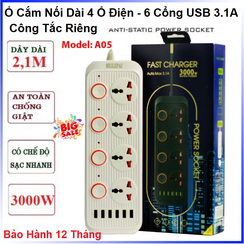 Giới thiệu Ổ Cắm Điện A05, Đa Năng Thông Minh, Tích Hợp 6 Cổng USB Sạc Nhanh 3.1A - Chống Cháy Nổ