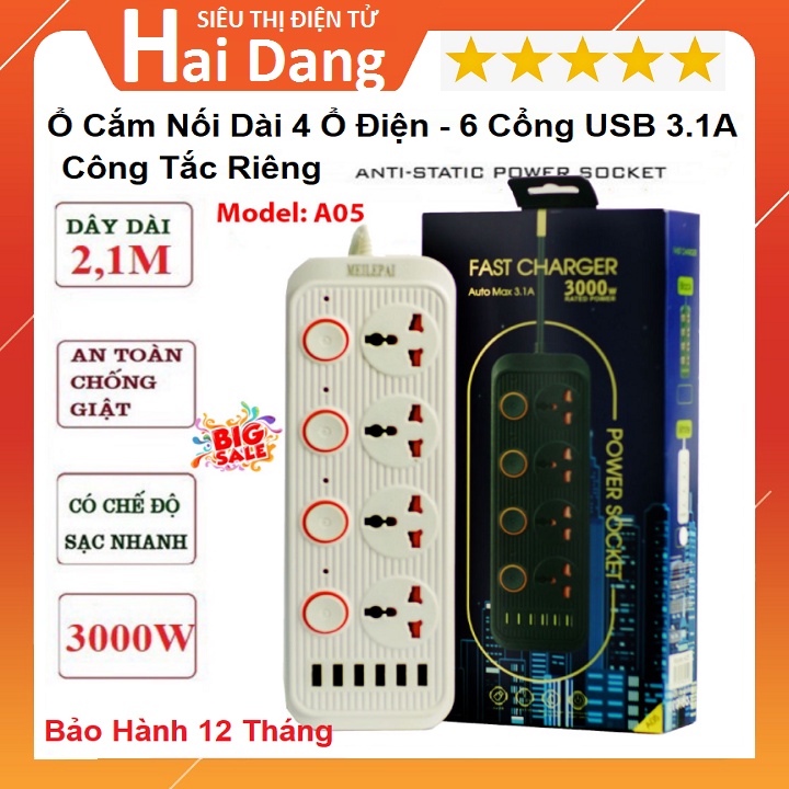 Thiết Bị Điện Gia Dụng > Mạch điện & Phụ tùng > Ổ cắm điện & Dây nối || Ổ Cắm Điện A05 Đa Năng Thông Minh, Tích Hợp 6 Cổng USB Sạc Nhanh 3.1A - Chống Cháy Nổ - Bảo Hành 24 ThángCòn hàng