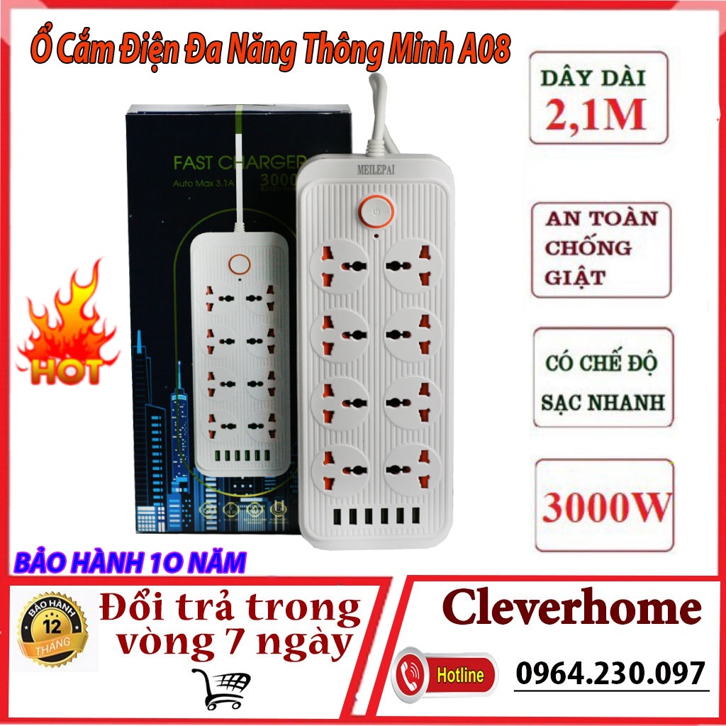 Giới thiệu Ổ cắm điện A08 Fast Charger Auto Max 3.1A - ổ điện đa năng thông minh an toàn chống giật, chống cháy nổ, lõi đồng