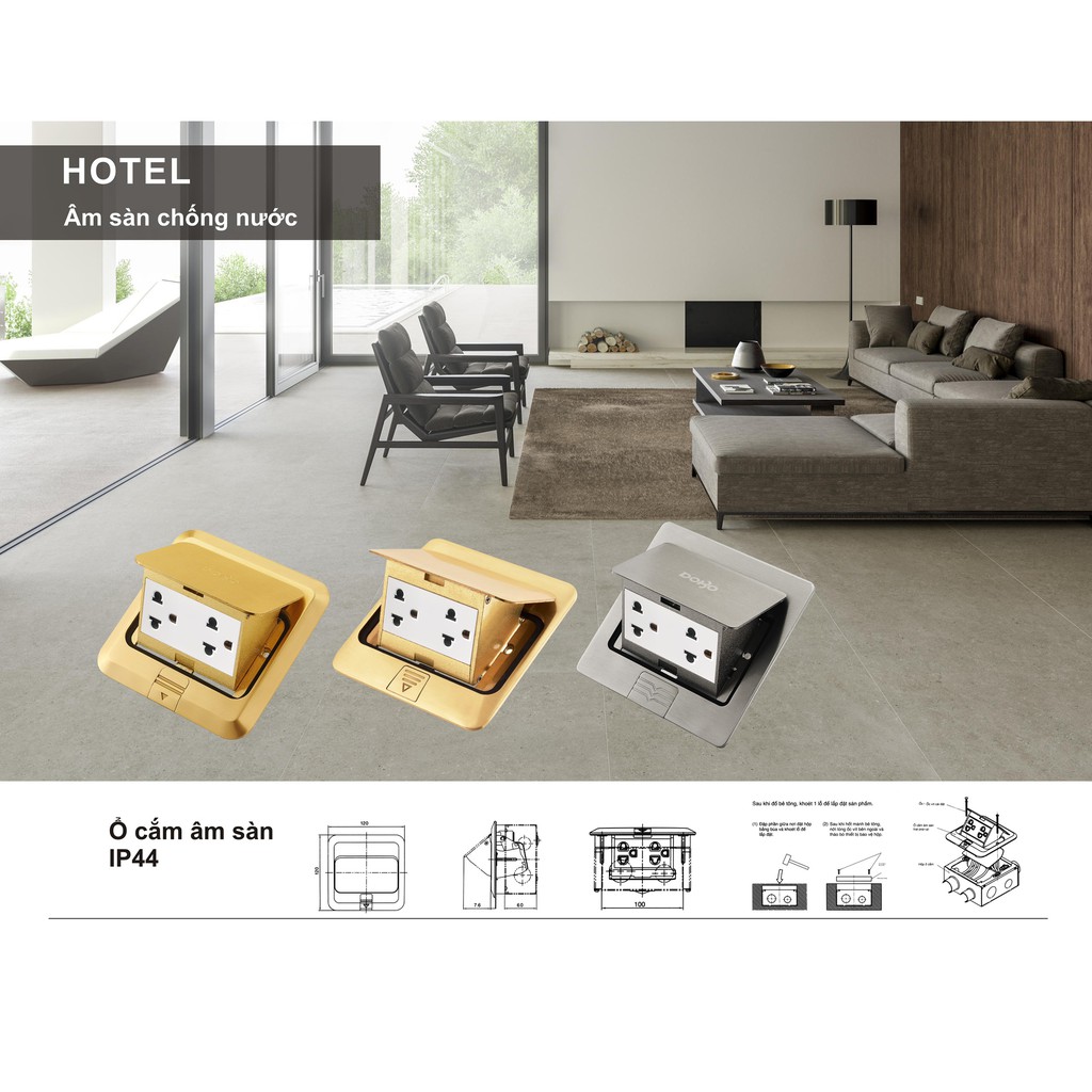 * Ổ cắm điện âm sàn cao cấp chống nước chuẩn IP 44 là sản phẩm được sử dụng rộng rãi và phổ biến phù hợp với mọi không gian như phòng ngủ, phòng ăn, phòng khách, phòng họp, khách sạn, ...