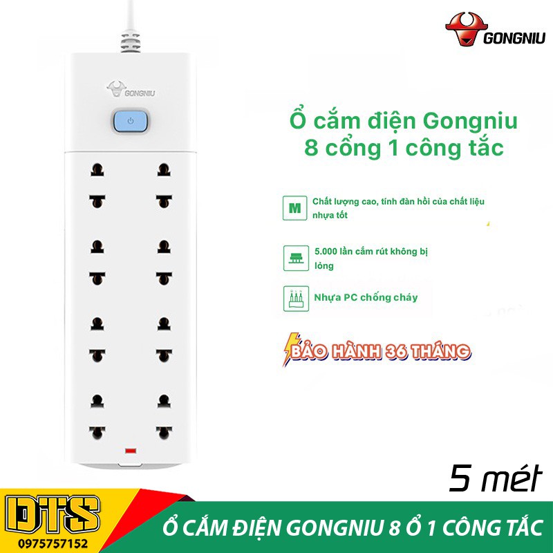 Ổ cắm điện an toàn cao cấp GONGNIU, ổ cắm điện đa năng 8 ổ 1 công tắc có dây 5m, bảo hành chính hãng 3 năm 1 đổi 1