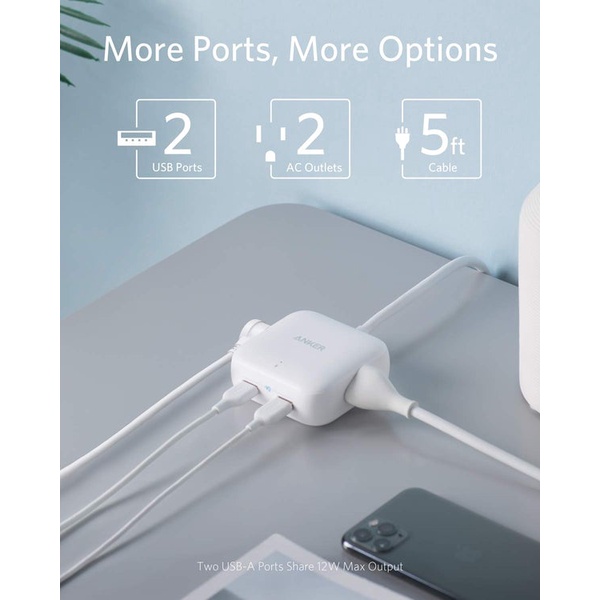 Ổ cắm điện Anker PowerPort Strip 2 mini - A9121 tặng đầu chuyển 3 chấu tích hợp sạc nhanh cho iPhone Samsung