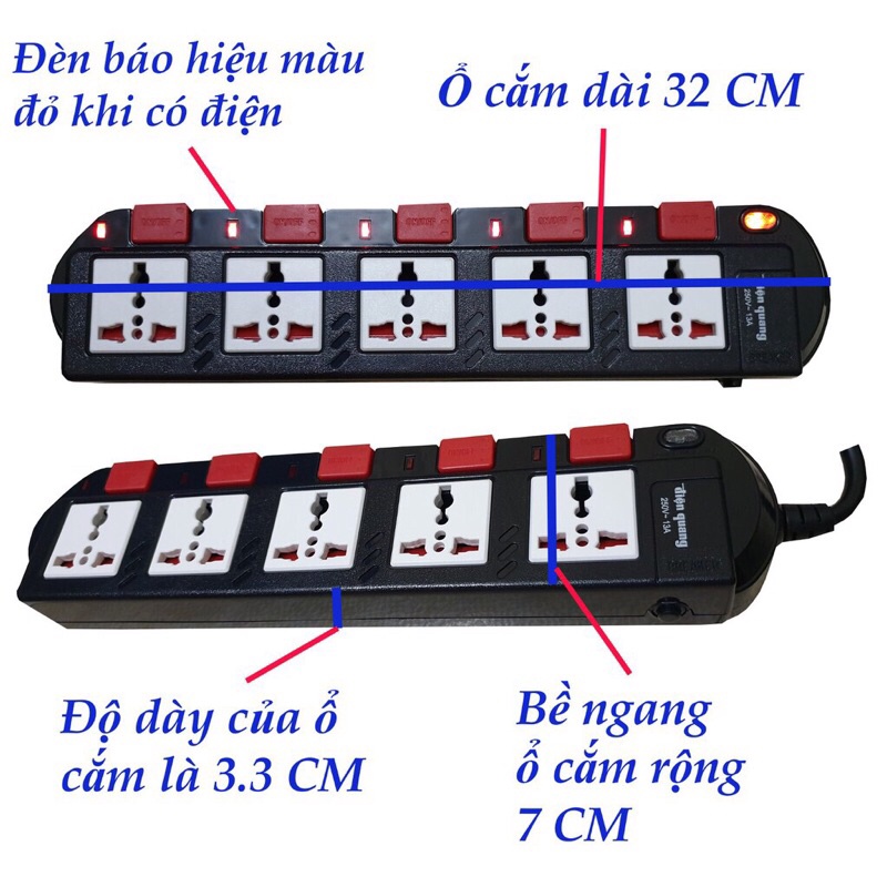 - Số ổ cắm: 5 ổ cắm 3 chấu đa năng (cắm được các loại phích cắm phi 4, phi 5, dẹp, 3 chân thẳng nhỏ... )