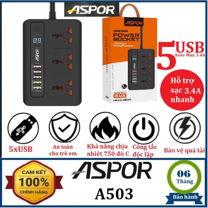Giới thiệu Ổ Cắm Điện Chính Hãng ASPOR A503, Với 5 Cổng USB - Sạc Nhanh 3.4A - Dây Dài 2M Tiêu - Chuẩn EU