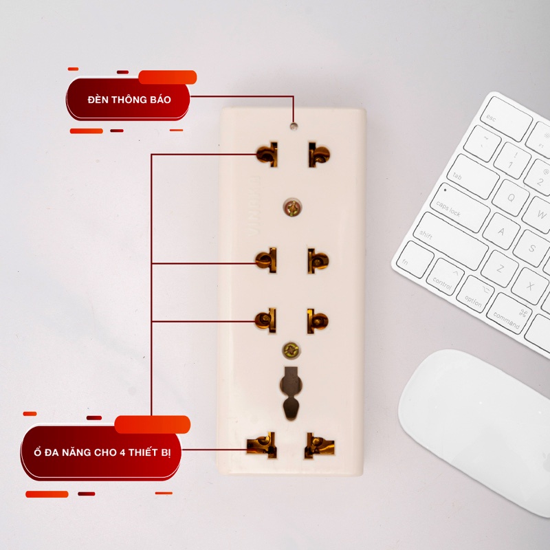 - Ổ điện đa năng: ổ cắm 4 chân gồm 2 ổ cắm 2 chân và 2 ổ điện 3 chấu, phù hợp với mọi kiểu chân phích tiện dụng cho người dùng.