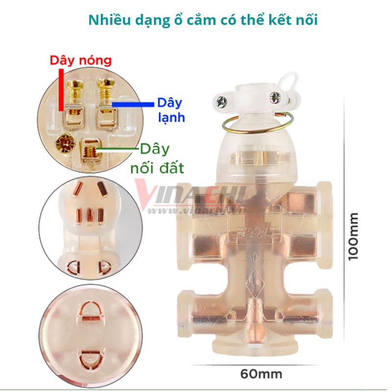 - Chân phích của ổ cắm làm bằng thau được đổ đặc, dài gần gấp đôi so với những sản phẩm khác trên thị trường (tính từ trong ra ngoài).