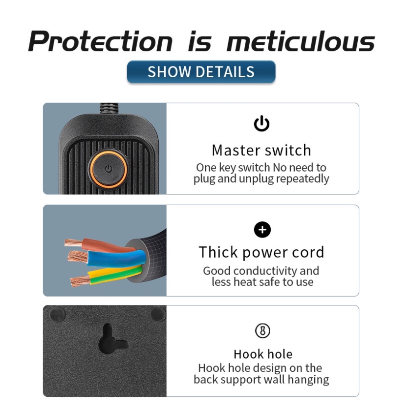 Cửa an toàn trên nhiều ổ cắm, bảo vệ quá tải tiên tiến được tích hợp sẵn có thể cung cấp sự bảo vệ hoàn hảo nhất khỏi quá áp, đột biến, cháy nổ. Với dây nối đất, để bảo vệ trẻ em khỏi những cú sốc điện có thể xảy ra.