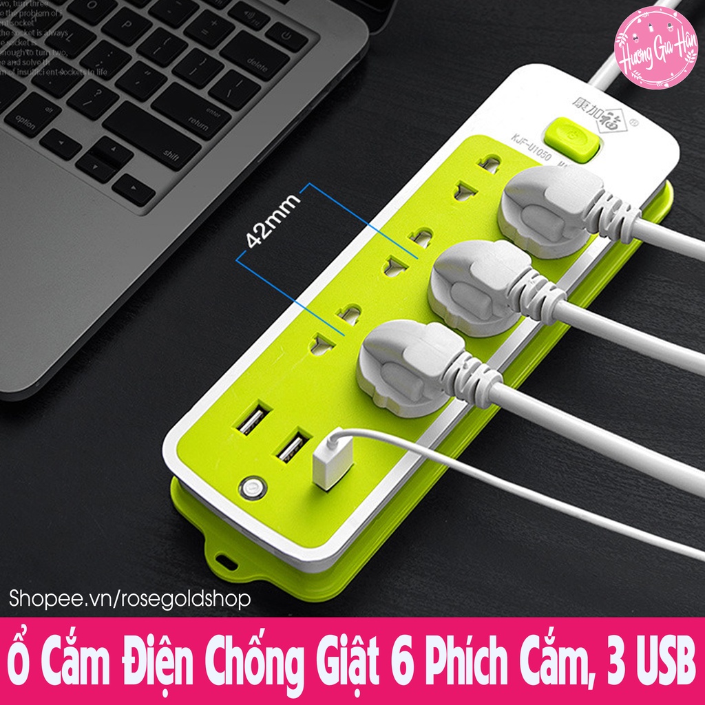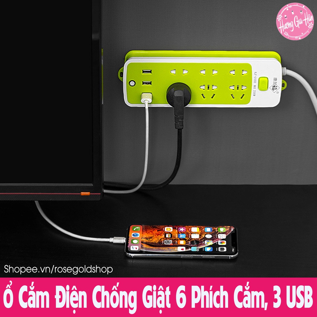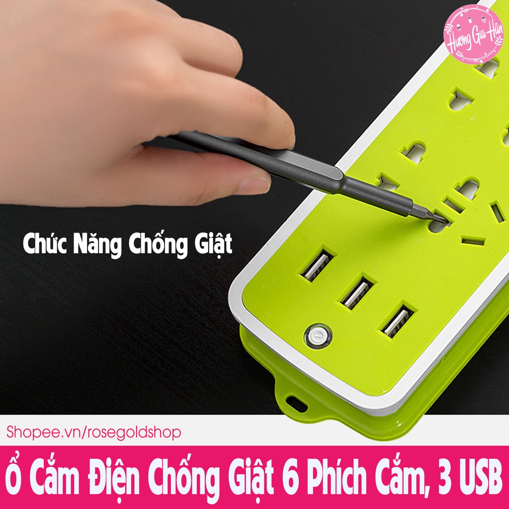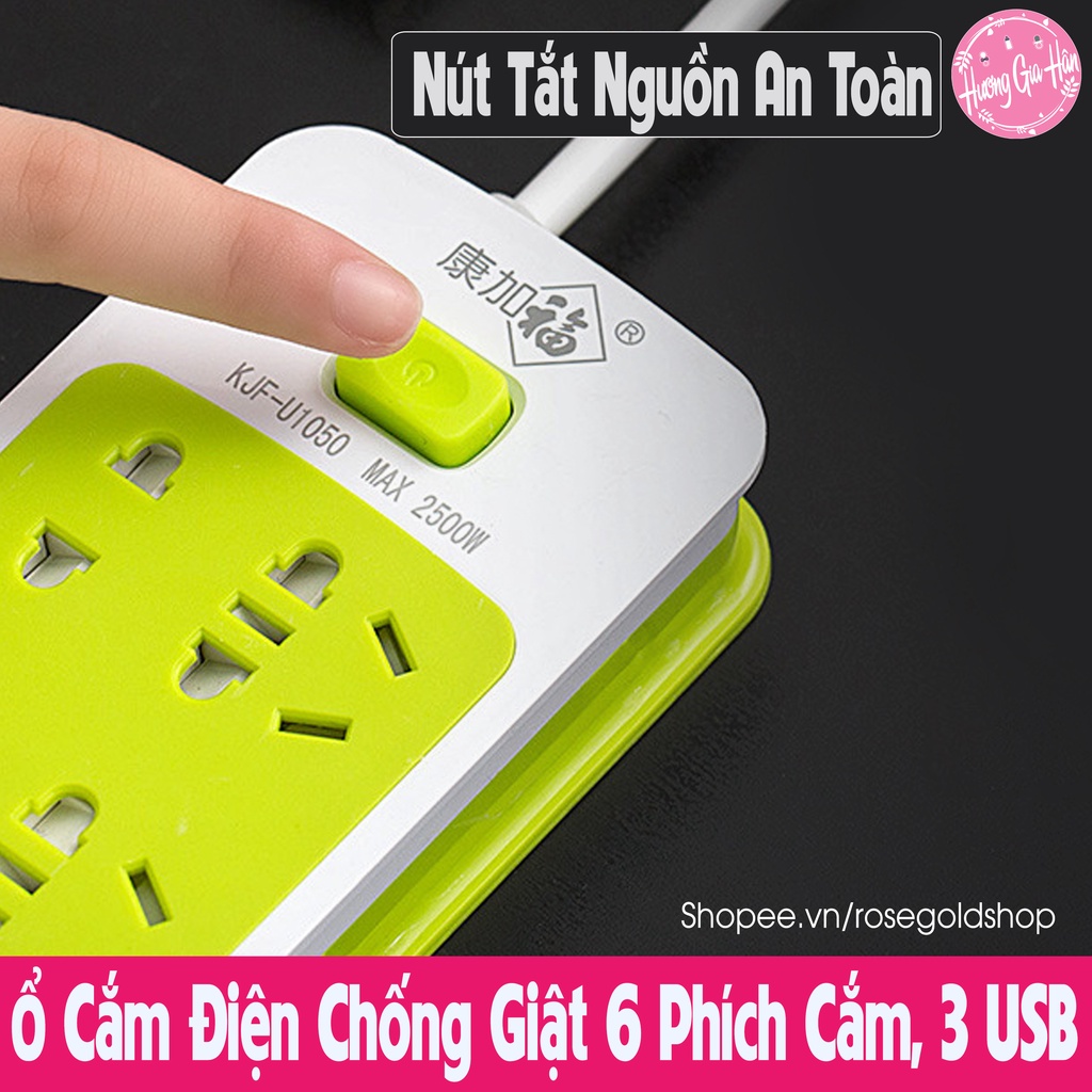 Chào mừng bạn đến với Hương Gia Hân shop (Rosegoldshop)Ổ Cắm Điện Chống Giật 6 Phích Cắm, Phù Hợp Cả Chân Tròn Và Dẹt, 3 Cổng USB, Nút Nguồn An Toàn Cho Trẻ Nhỏ